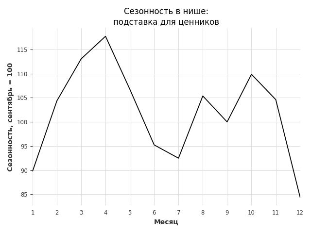 Сезонность в нише слабая. Пик сезонных продаж в нише - ноябрь. В ближайшие месяцы можно ожидать сезонного роста продаж до 60%.