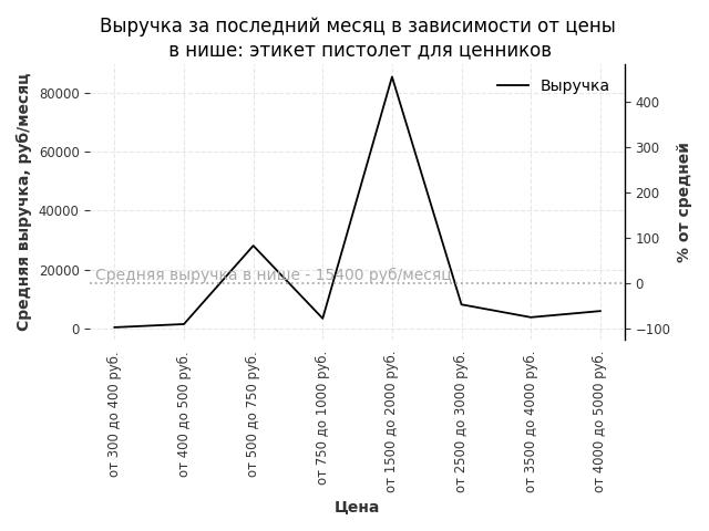 Средняя выручка в нише - 15400 руб./месяц. Максимальная выручка 85400 руб./месяц, на 450% больше среднего в нише, была при цене от 1500 до 2000 руб. руб.