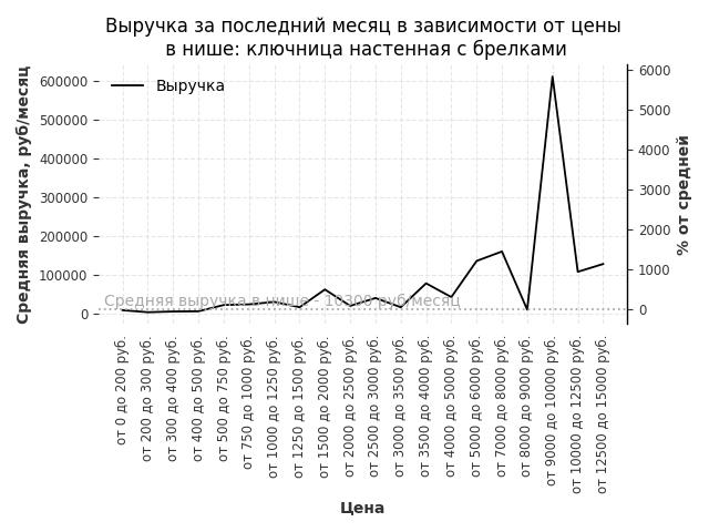 Средняя выручка в нише - 12400 руб./месяц. Максимальная выручка 80700 руб./месяц, на 550% больше среднего в нише, была при цене от 6000 до 7000 руб. руб.