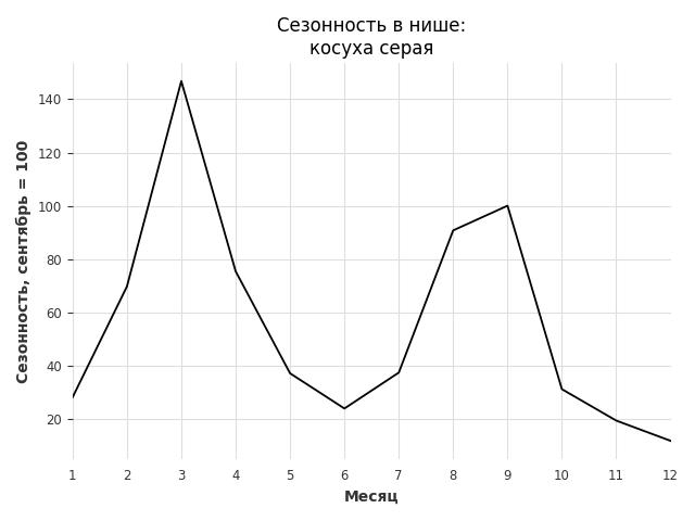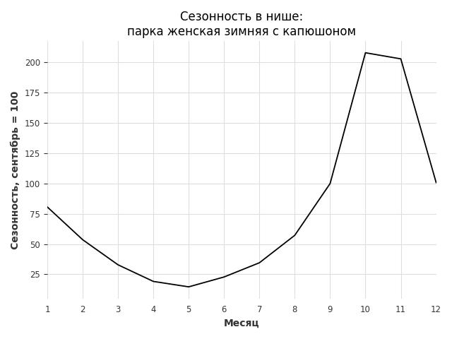 Сезонность в нише сильная. Пик сезонных продаж в нише - октябрь. В ближайшие месяцы можно ожидать сезонного роста продаж до 108%.