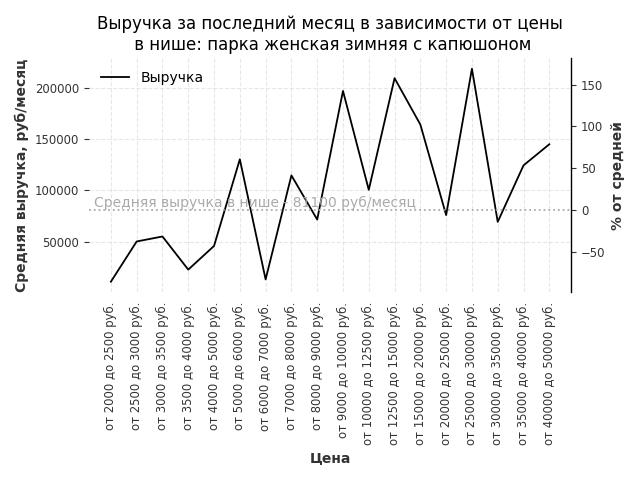 Средняя выручка в нише - 81100 руб./месяц. Максимальная выручка 218300 руб./месяц, на 170% больше среднего в нише, была при цене от 25000 до 30000 руб. руб.