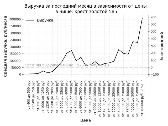 Средняя выручка в нише - 52000 руб./месяц. Максимальная выручка 408000 руб./месяц, на 680% больше среднего в нише, была при цене от 100000 руб. и выше руб.