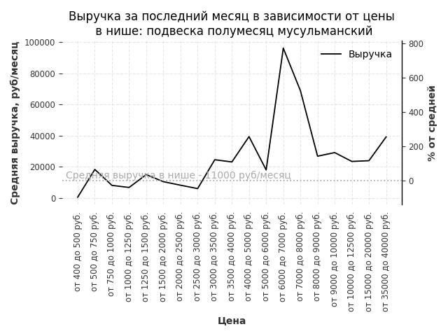 Средняя выручка в нише - 11000 руб./месяц. Максимальная выручка 96100 руб./месяц, на 770% больше среднего в нише, была при цене от 6000 до 7000 руб. руб.