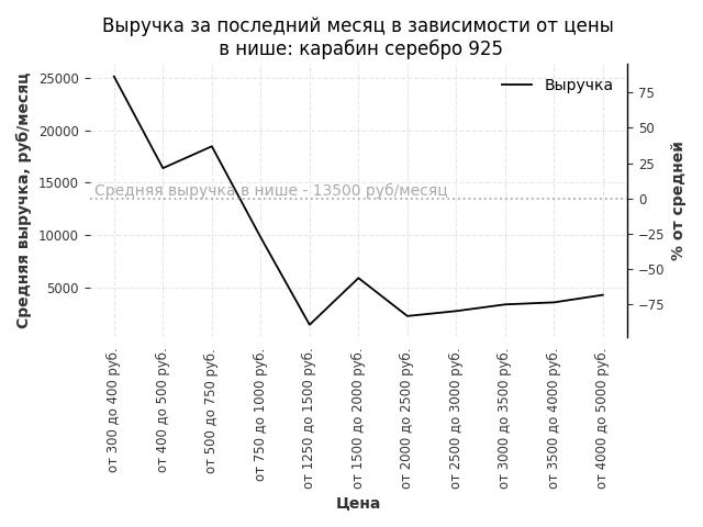 Средняя выручка в нише - 13500 руб./месяц. Максимальная выручка 25200 руб./месяц, на 90% больше среднего в нише, была при цене от 300 до 400 руб. руб.