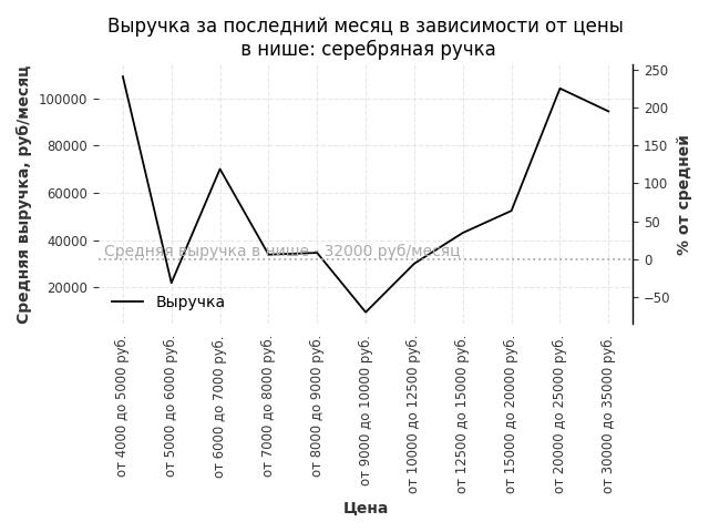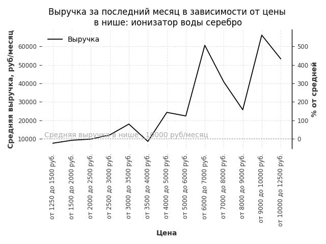 Средняя выручка в нише - 10000 руб./месяц. Максимальная выручка 66100 руб./месяц, на 560% больше среднего в нише, была при цене от 9000 до 10000 руб. руб.