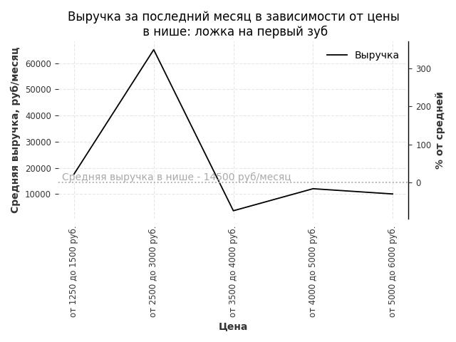 Средняя выручка в нише - 14500 руб./месяц. Максимальная выручка 65200 руб./месяц, на 350% больше среднего в нише, была при цене от 2500 до 3000 руб. руб.