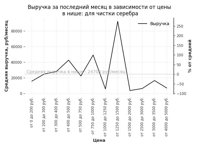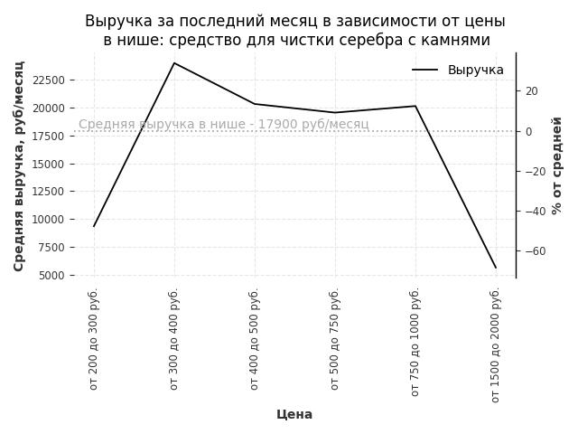 Средняя выручка в нише - 24700 руб./месяц. Максимальная выручка 92400 руб./месяц, на 270% больше среднего в нише, была при цене от 1250 до 1500 руб. руб.