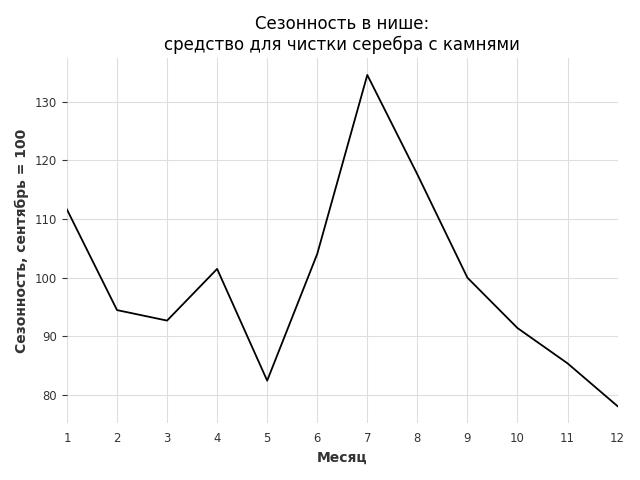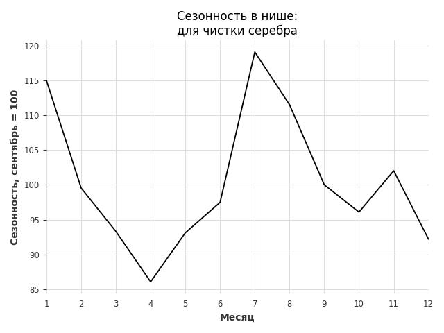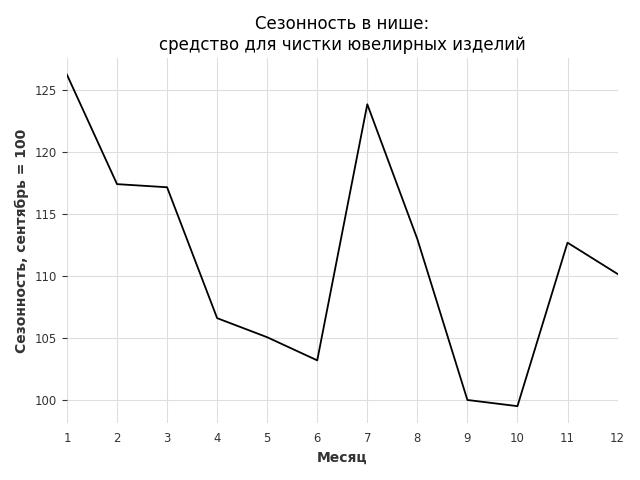 Сезонность в нише слабая. Пик сезонных продаж в нише - июль. В ближайшие месяцы можно ожидать сезонного спада продаж до 22%.