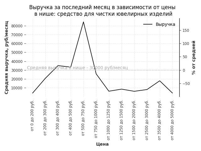 Средняя выручка в нише - 30000 руб./месяц. Максимальная выручка 84300 руб./месяц, на 180% больше среднего в нише, была при цене от 500 до 750 руб. руб.