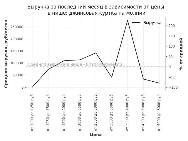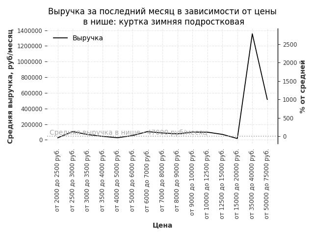 Средняя выручка в нише - 84900 руб./месяц. Максимальная выручка 275900 руб./месяц, на 220% больше среднего в нише, была при цене от 3500 до 4000 руб. руб.