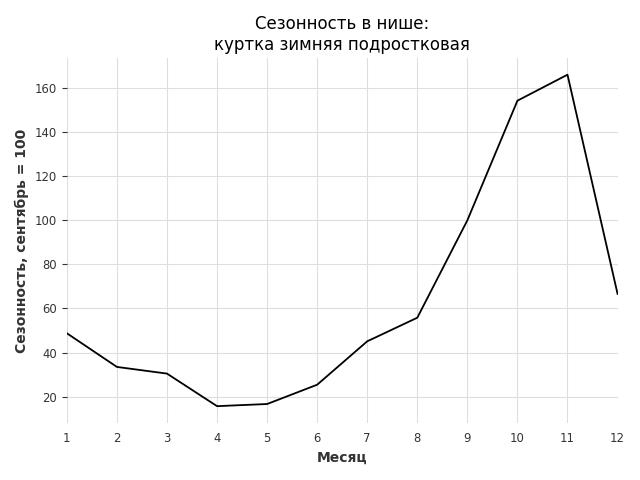 Сезонность в нише сильная. Пик сезонных продаж в нише - ноябрь. В ближайшие месяцы можно ожидать сезонного роста продаж до 66%.