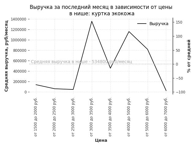 Средняя выручка в нише - 534800 руб./месяц. Максимальная выручка 1354100 руб./месяц, на 150% больше среднего в нише, была при цене от 3000 до 3500 руб. руб.