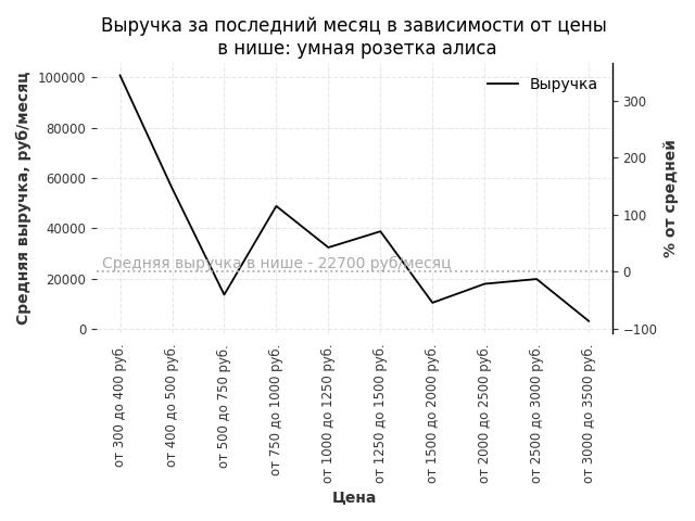 Средняя выручка в нише - 22700 руб./месяц. Максимальная выручка 100800 руб./месяц, на 340% больше среднего в нише, была при цене от 300 до 400 руб. руб.