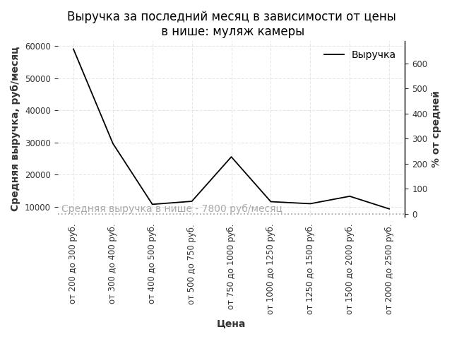 Средняя выручка в нише - 7800 руб./месяц. Максимальная выручка 59100 руб./месяц, на 660% больше среднего в нише, была при цене от 200 до 300 руб. руб.
