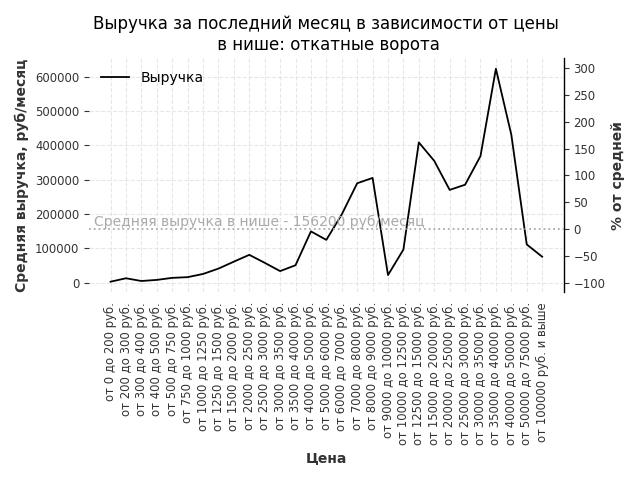 Средняя выручка в нише - 156200 руб./месяц. Максимальная выручка 623000 руб./месяц, на 300% больше среднего в нише, была при цене от 35000 до 40000 руб. руб.