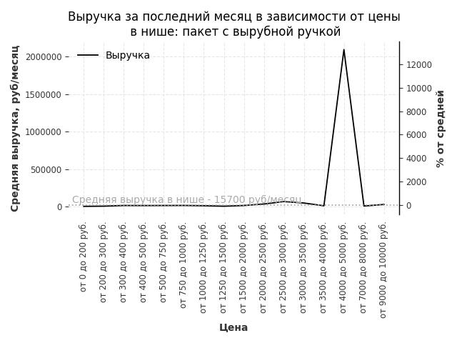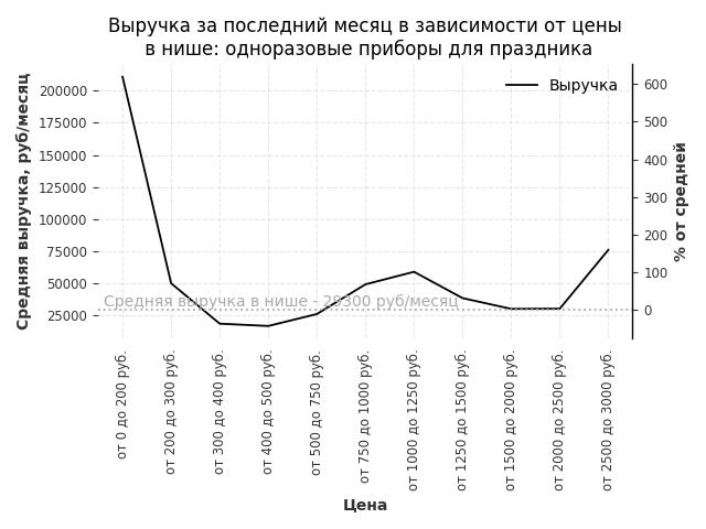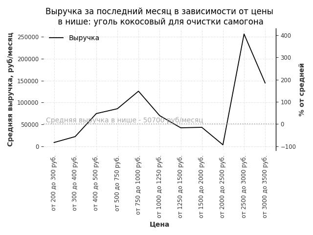 Средняя выручка в нише - 50700 руб./месяц. Максимальная выручка 256500 руб./месяц, на 410% больше среднего в нише, была при цене от 2500 до 3000 руб. руб.