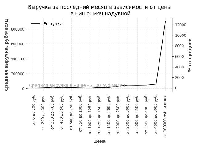 Средняя выручка в нише - 7100 руб./месяц. Максимальная выручка 905400 руб./месяц, на 12650% больше среднего в нише, была при цене от 100000 руб. и выше руб.