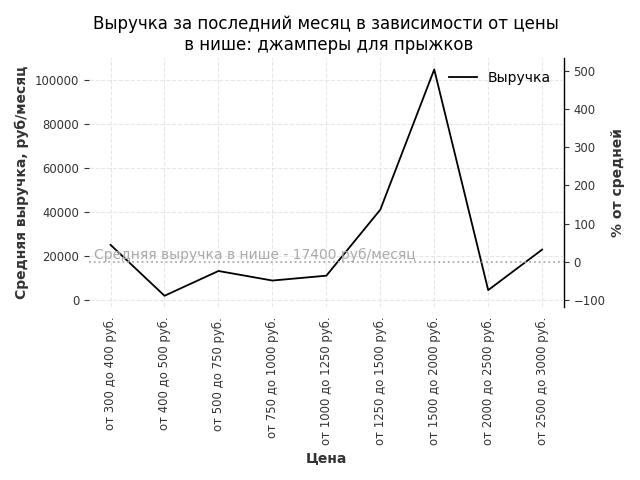 Средняя выручка в нише - 17400 руб./месяц. Максимальная выручка 105000 руб./месяц, на 500% больше среднего в нише, была при цене от 1500 до 2000 руб. руб.