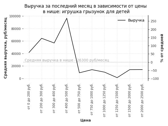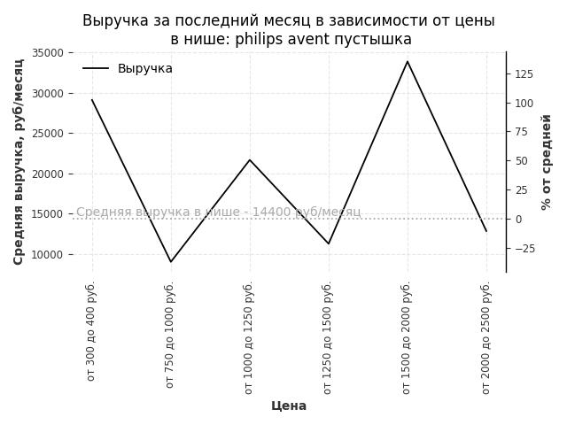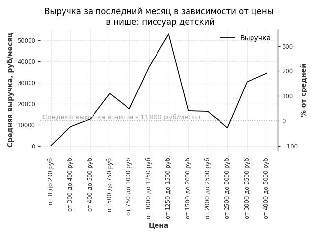 Средняя выручка в нише - 11800 руб./месяц. Максимальная выручка 52800 руб./месяц, на 350% больше среднего в нише, была при цене от 1250 до 1500 руб. руб.