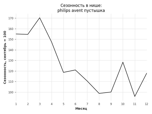 Сезонность в нише слабая. Пик сезонных продаж в нише - март. В ближайшие месяцы можно ожидать сезонного роста продаж до 28%.