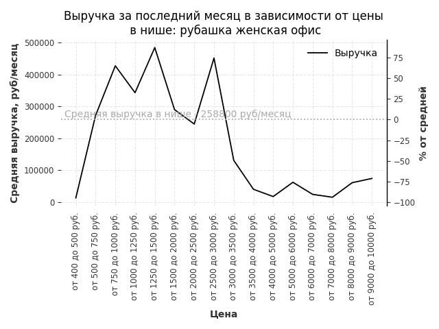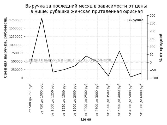 Средняя выручка в нише - 258800 руб./месяц. Максимальная выручка 484100 руб./месяц, на 90% больше среднего в нише, была при цене от 1250 до 1500 руб. руб.