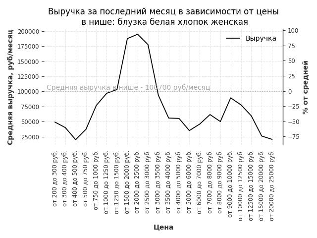 Средняя выручка в нише - 100700 руб./месяц. Максимальная выручка 194900 руб./месяц, на 90% больше среднего в нише, была при цене от 2000 до 2500 руб. руб.