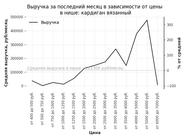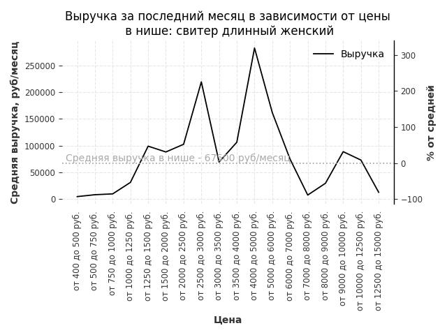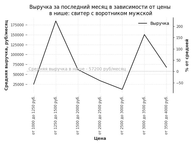 Средняя выручка в нише - 57200 руб./месяц. Максимальная выручка 184900 руб./месяц, на 220% больше среднего в нише, была при цене от 1250 до 1500 руб. руб.