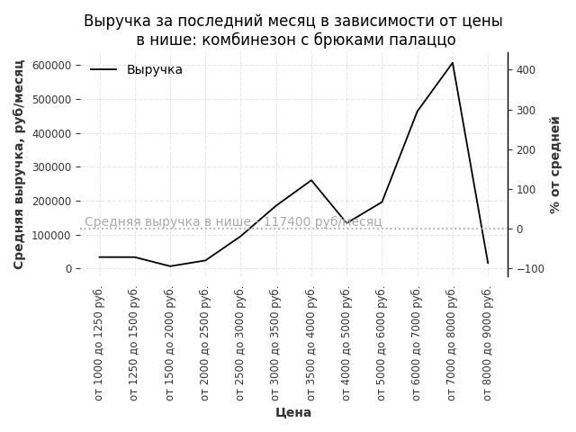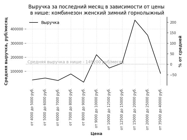 Средняя выручка в нише - 149200 руб./месяц. Максимальная выручка 462900 руб./месяц, на 210% больше среднего в нише, была при цене от 15000 до 20000 руб. руб.