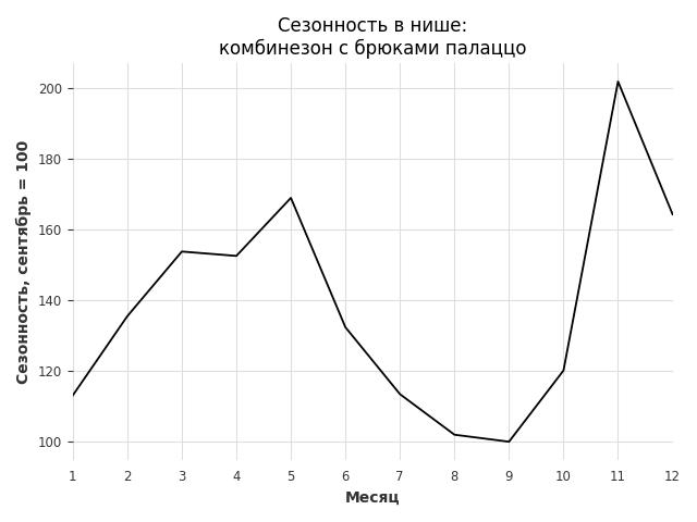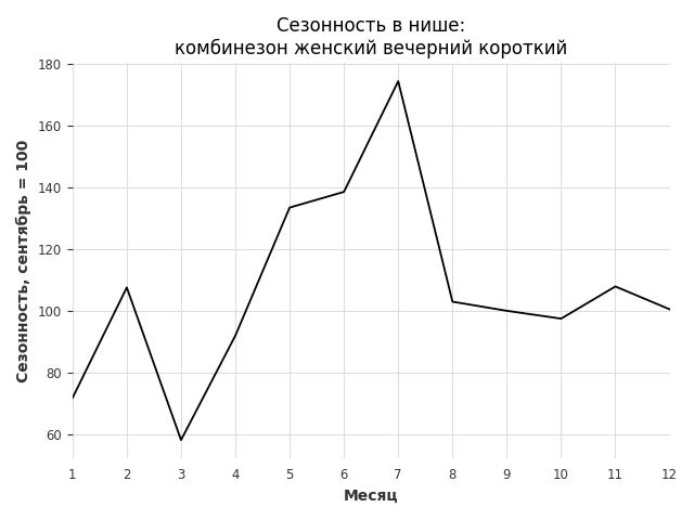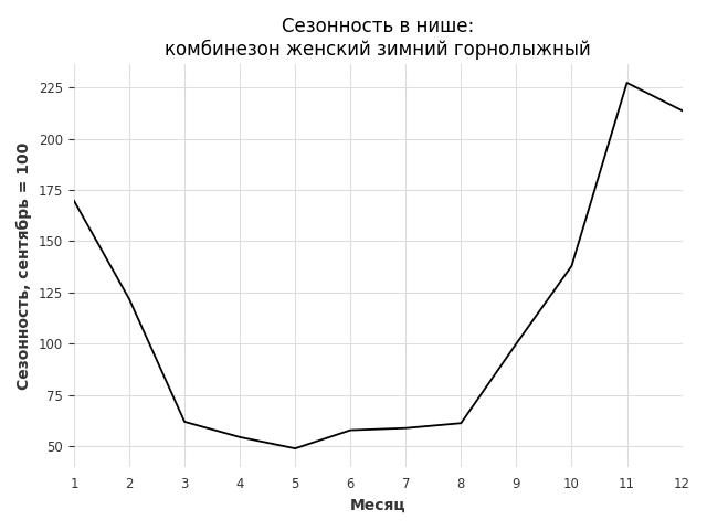 Сезонность в нише сильная. Пик сезонных продаж в нише - ноябрь. В ближайшие месяцы можно ожидать сезонного роста продаж до 127%.