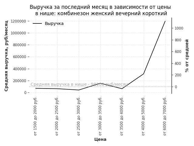 Средняя выручка в нише - 98100 руб./месяц. Максимальная выручка 1193800 руб./месяц, на 1120% больше среднего в нише, была при цене от 6000 до 7000 руб. руб.
