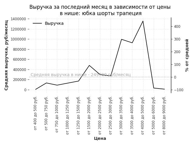 Средняя выручка в нише - 249700 руб./месяц. Максимальная выручка 1354000 руб./месяц, на 440% больше среднего в нише, была при цене от 4000 до 5000 руб. руб.