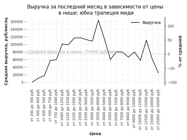 Средняя выручка в нише - 74400 руб./месяц. Максимальная выручка 163900 руб./месяц, на 120% больше среднего в нише, была при цене от 3500 до 4000 руб. руб.