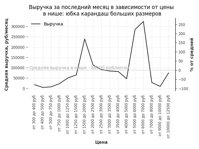 Средняя выручка в нише - 88500 руб./месяц. Максимальная выручка 324300 руб./месяц, на 270% больше среднего в нише, была при цене от 6000 до 7000 руб. руб.