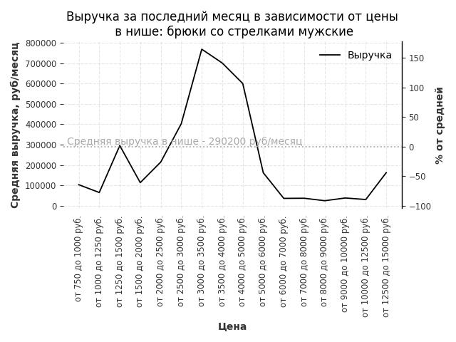 Средняя выручка в нише - 290200 руб./месяц. Максимальная выручка 768700 руб./месяц, на 160% больше среднего в нише, была при цене от 3000 до 3500 руб. руб.