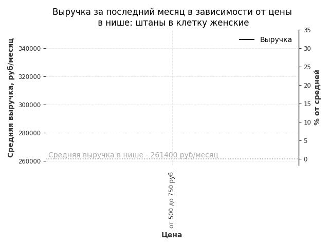 Средняя выручка в нише - 261400 руб./месяц. Максимальная выручка 348600 руб./месяц, на 30% больше среднего в нише, была при цене от 500 до 750 руб. руб.