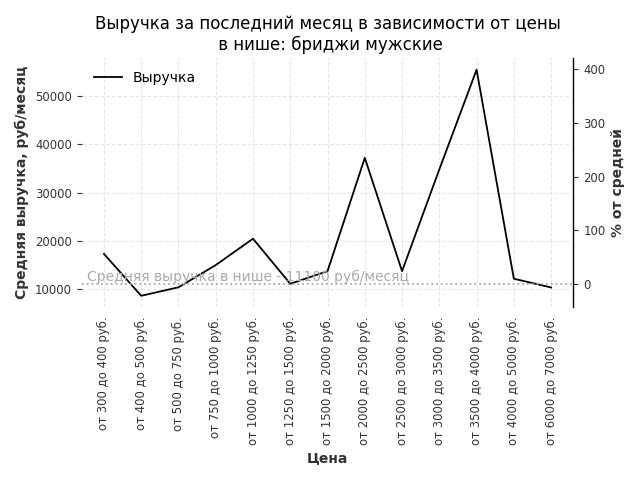 Средняя выручка в нише - 11100 руб./месяц. Максимальная выручка 55400 руб./месяц, на 400% больше среднего в нише, была при цене от 3500 до 4000 руб. руб.
