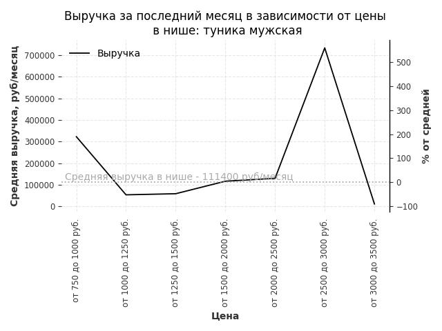 Средняя выручка в нише - 111400 руб./месяц. Максимальная выручка 733800 руб./месяц, на 560% больше среднего в нише, была при цене от 2500 до 3000 руб. руб.