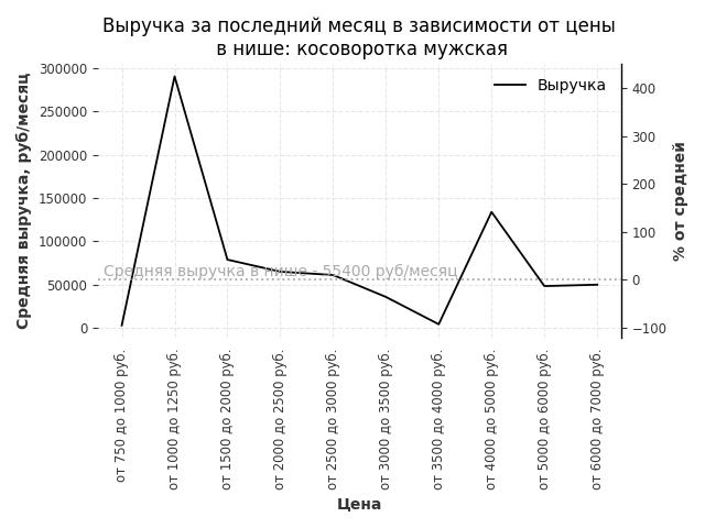Средняя выручка в нише - 55400 руб./месяц. Максимальная выручка 290800 руб./месяц, на 420% больше среднего в нише, была при цене от 1000 до 1250 руб. руб.