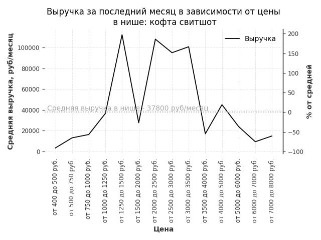 Средняя выручка в нише - 37800 руб./месяц. Максимальная выручка 112400 руб./месяц, на 200% больше среднего в нише, была при цене от 1250 до 1500 руб. руб.