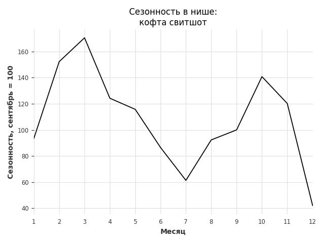 Сезонность в нише средняя. Пик сезонных продаж в нише - сентябрь. В ближайшие месяцы можно ожидать сезонного спада продаж до 24%.