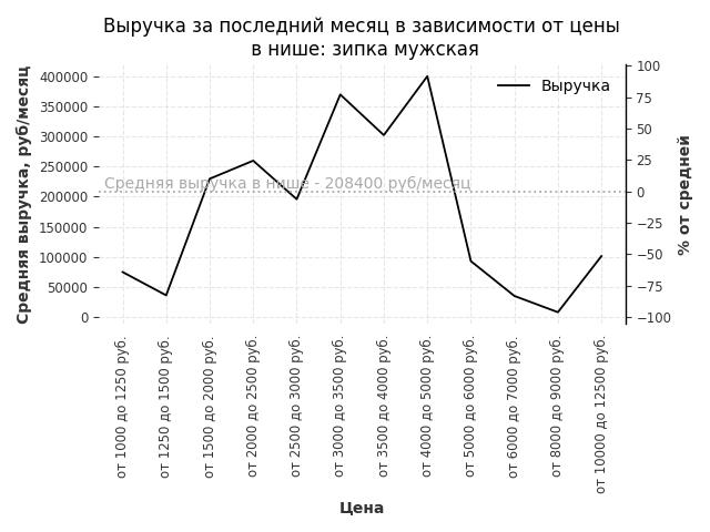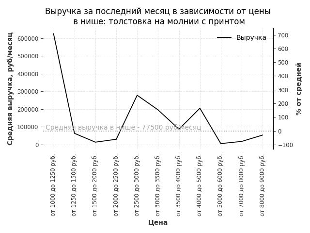 Средняя выручка в нише - 77500 руб./месяц. Максимальная выручка 625700 руб./месяц, на 710% больше среднего в нише, была при цене от 1000 до 1250 руб. руб.