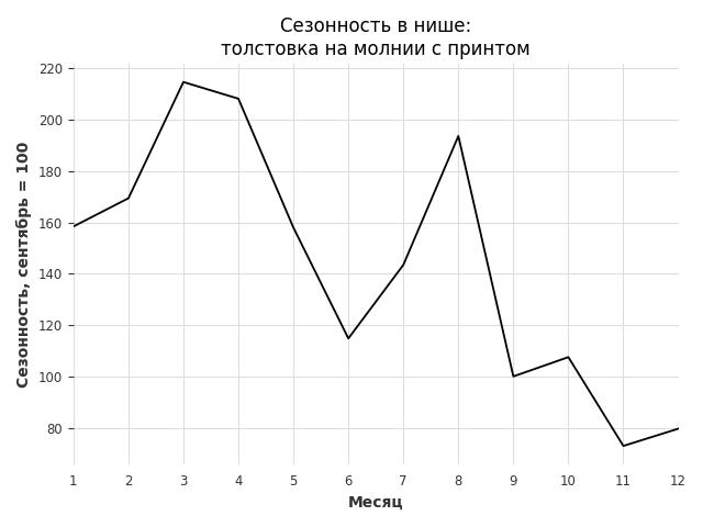 Сезонность в нише средняя. Пик сезонных продаж в нише - март. В ближайшие месяцы можно ожидать сезонного спада продаж до 28%.