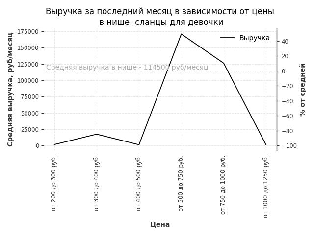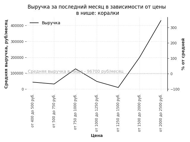 Средняя выручка в нише - 96700 руб./месяц. Максимальная выручка 430100 руб./месяц, на 340% больше среднего в нише, была при цене от 2000 до 2500 руб. руб.