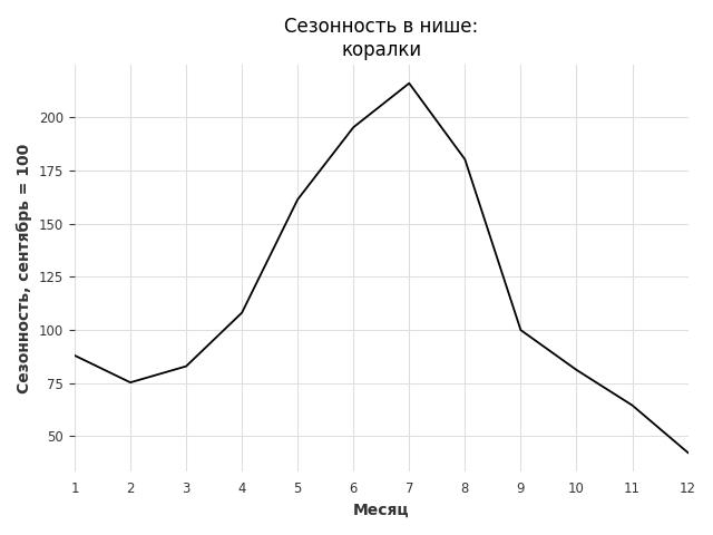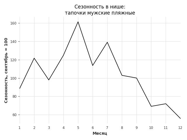 Сезонность в нише сильная. Пик сезонных продаж в нише - июль. В ближайшие месяцы можно ожидать сезонного спада продаж до 58%.