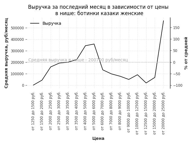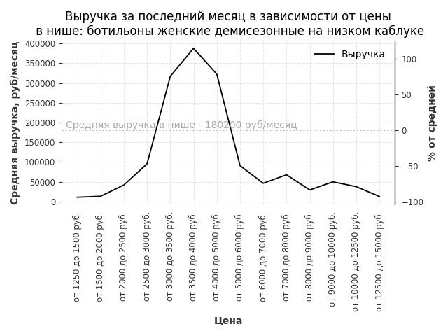 Средняя выручка в нише - 180200 руб./месяц. Максимальная выручка 387600 руб./месяц, на 120% больше среднего в нише, была при цене от 3500 до 4000 руб. руб.