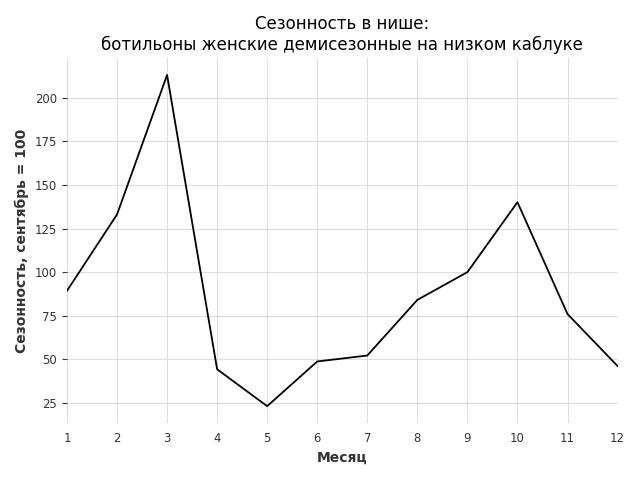 Сезонность в нише сильная. Пик сезонных продаж в нише - сентябрь. В ближайшие месяцы можно ожидать сезонного спада продаж до 72%.