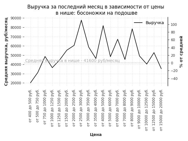 Средняя выручка в нише - 41600 руб./месяц. Максимальная выручка 87700 руб./месяц, на 110% больше среднего в нише, была при цене от 2500 до 3000 руб. руб.