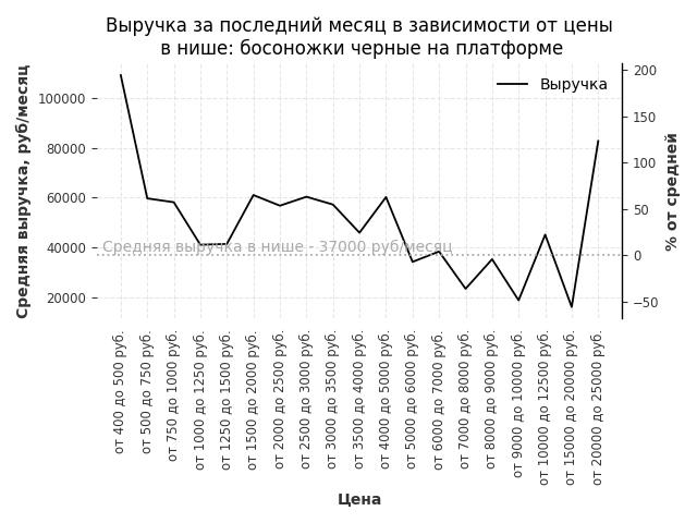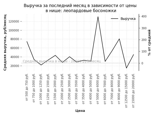 Средняя выручка в нише - 26200 руб./месяц. Максимальная выручка 130100 руб./месяц, на 400% больше среднего в нише, была при цене от 5000 до 6000 руб. руб.
