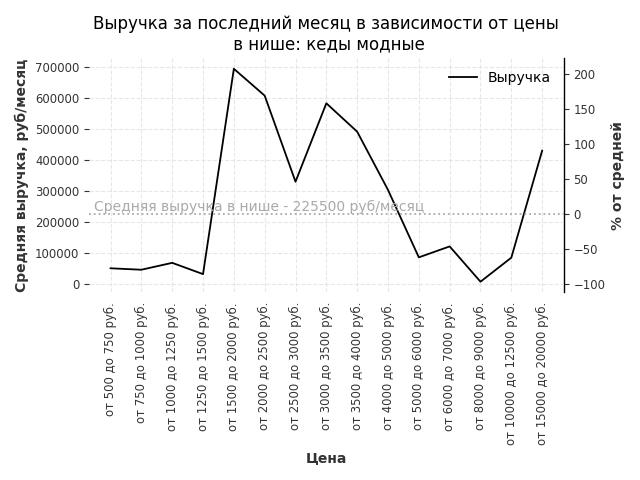 Средняя выручка в нише - 225500 руб./месяц. Максимальная выручка 694100 руб./месяц, на 210% больше среднего в нише, была при цене от 1500 до 2000 руб. руб.
