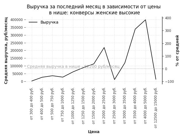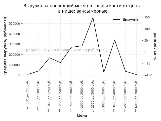 Средняя выручка в нише - 224900 руб./месяц. Максимальная выручка 557600 руб./месяц, на 150% больше среднего в нише, была при цене от 2500 до 3000 руб. руб.